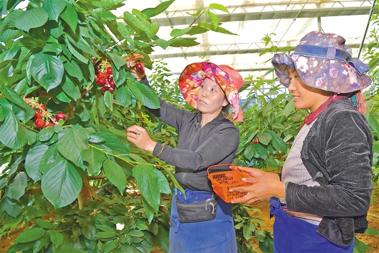 圖為工作人員在采摘櫻桃。記者 索朗旺久 攝