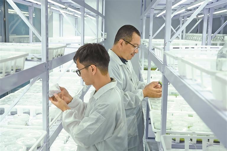 圖為基地工作人員正在檢查組織培養(yǎng)瓶里植物的長勢。圖/文 記者 謝筱純 王珊