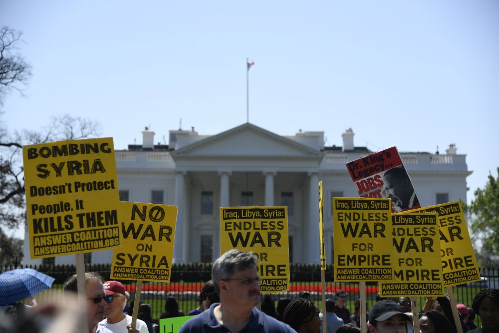 2018年4月14日,在美國華盛頓白宮北側(cè),人們手持標(biāo)語抗議對(duì)敘利亞進(jìn)行軍事打擊。新華社記者楊承霖?cái)z