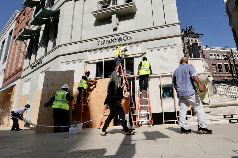 2020年11月2日,美國洛杉磯縣貝弗利山市商業(yè)區(qū)的商家將店鋪門窗封上。為應(yīng)對(duì)當(dāng)時(shí)美國大選可能出現(xiàn)的抗議或騷亂,貝弗利山市不少商業(yè)區(qū)加強(qiáng)防護(hù)和安保。 新華社發(fā)