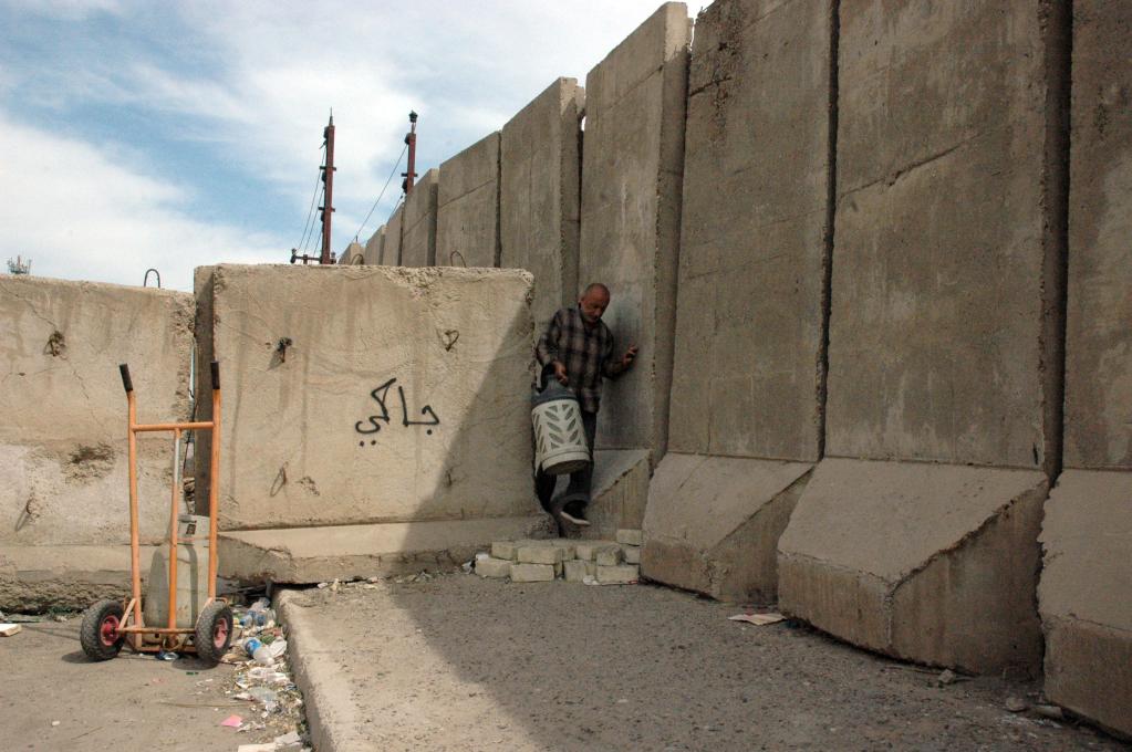 2013年3月20日,在伊拉克首都巴格達(dá),一名伊拉克人從防爆墻的縫隙之間穿過(guò)。新華社發(fā)(巴沙爾攝)