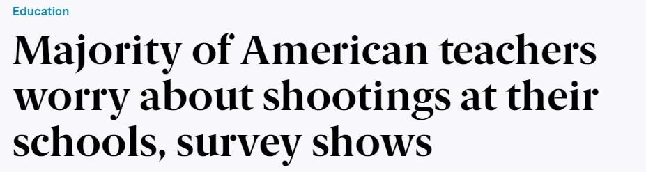 報(bào)道稱,2023年,美國(guó)發(fā)生的校園槍擊事件數(shù)量達(dá)到了歷史新高。在接受皮尤調(diào)查的受訪者中,59%的人對(duì)校園槍擊表示擔(dān)心,其中18%的人說自己對(duì)此感到“非?!被蛘摺皹O度”擔(dān)心。只有7%的受訪教師稱,他們完全不擔(dān)心校園槍擊的發(fā)生。