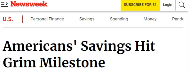 美國(guó)富國(guó)銀行(Wells Fargo)分享給《新聞周刊》(Newsweek)的一份分析報(bào)告顯示,美國(guó)人的儲(chǔ)蓄速度正在下降,達(dá)到一年多來的最低水平。與此同時(shí),另一項(xiàng)調(diào)查指出,近38%的美國(guó)人不得不動(dòng)用儲(chǔ)蓄或求助家人朋友以應(yīng)對(duì)日常支出。有超過半數(shù)的美國(guó)人認(rèn)為通脹是美國(guó)當(dāng)前面臨的一個(gè)比移民和犯罪等更大的問題。