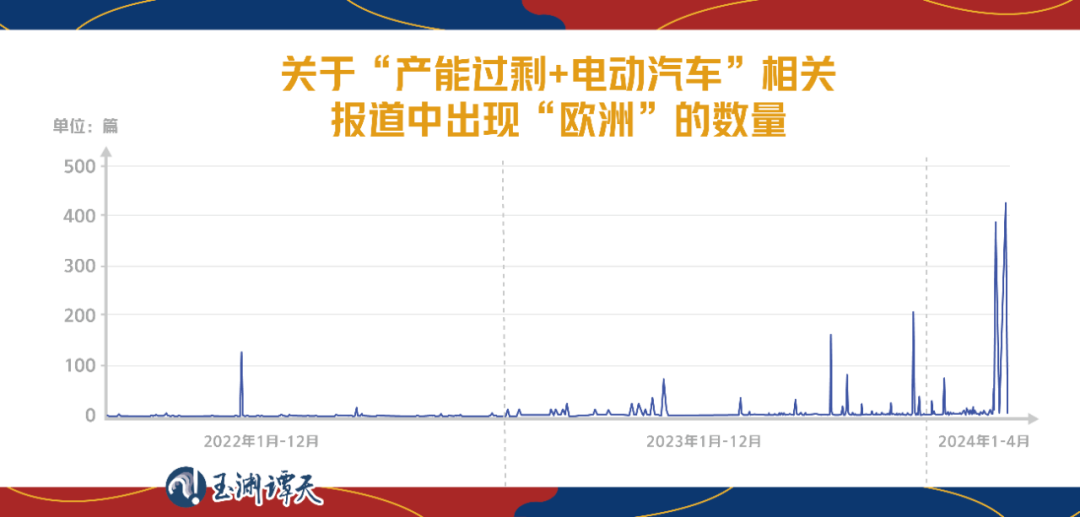為了拆解美方的敘事套路,我們又定向?qū)λ^中國“產(chǎn)能過剩論”的報道中有關(guān)“新能源汽車”報道的趨勢變化進(jìn)行了分析。