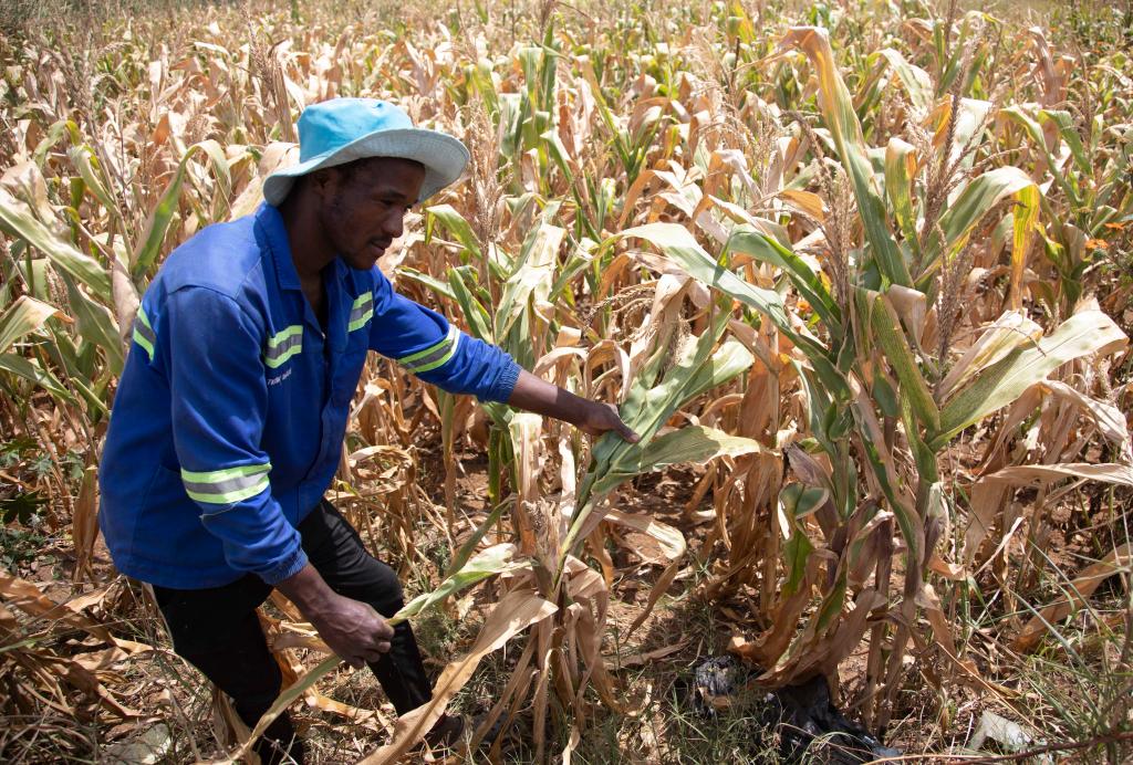 4月3日,農(nóng)民在津巴布韋首都哈拉雷近郊的一塊玉米地檢查作物長勢。津巴布韋總統(tǒng)姆南加古瓦宣布,由于厄爾尼諾現(xiàn)象造成嚴重干旱,全國進入災害狀態(tài)。新華社發(fā),肖恩·朱薩攝