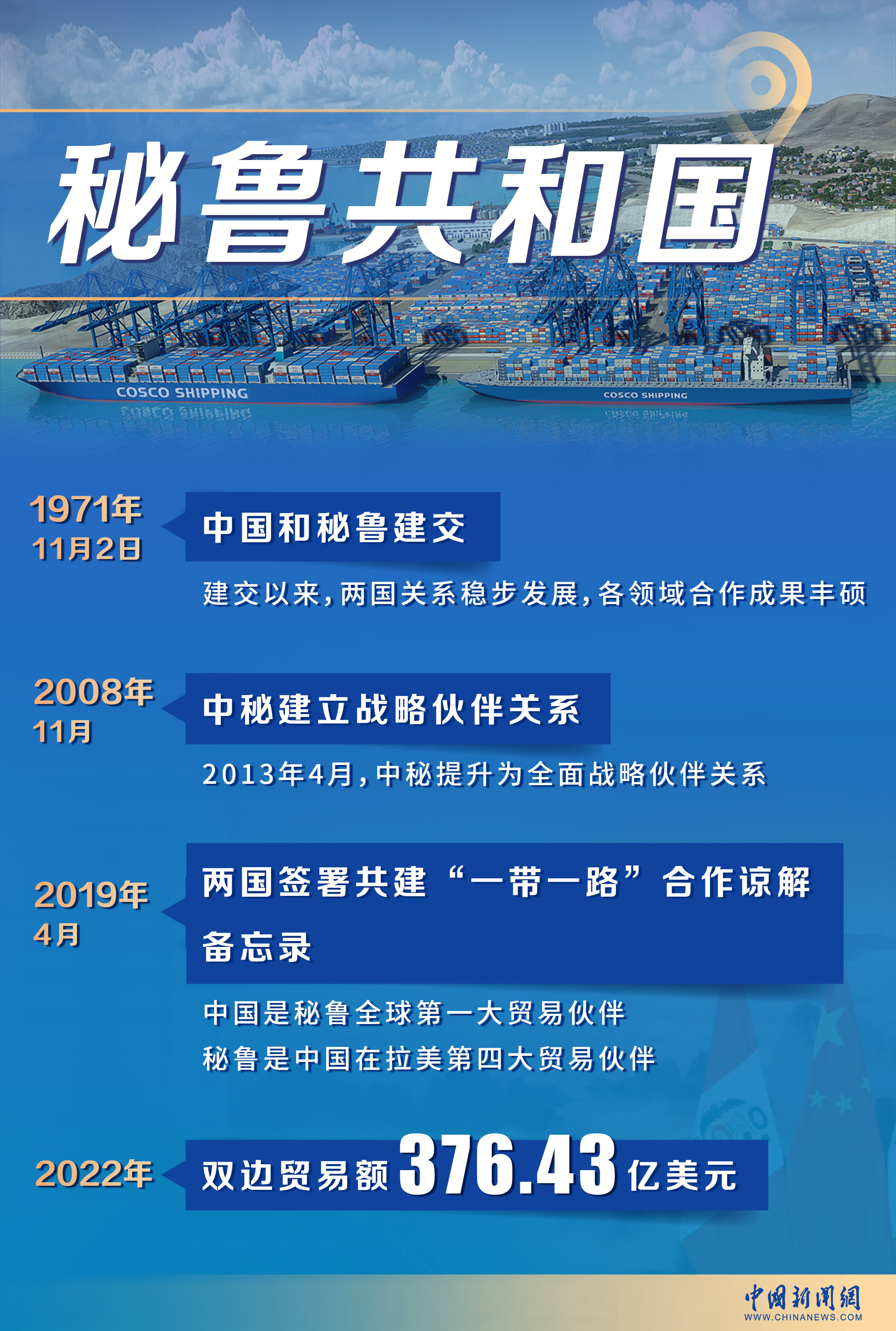 2022年,中秘雙邊貿易額達376.43億美元,目前,中國是秘魯全球第一大貿易伙伴、第一大出口市場和第一大進口來源國,秘魯也是中國在拉美第四大貿易伙伴。