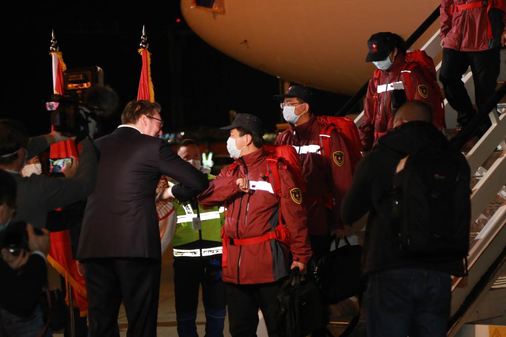 2020年3月21日,在塞爾維亞首都貝爾格萊德,前來(lái)迎接的塞爾維亞總統(tǒng)武契奇(左)與中國(guó)援助塞爾維亞抗疫醫(yī)療專(zhuān)家組成員“碰肘”致意。新華社記者石中玉攝