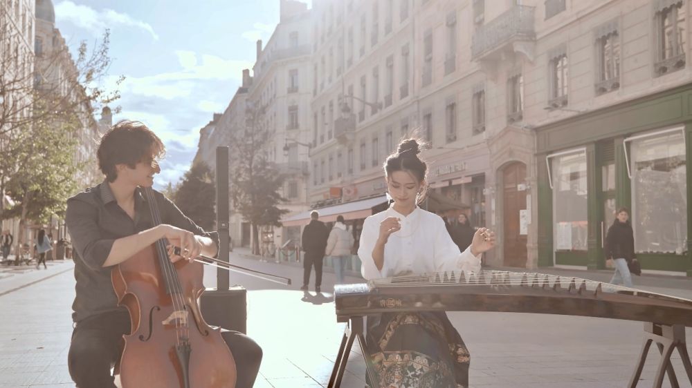 在彭靜旋的視頻中,有一個(gè)在法國(guó)尼斯與街頭鋼琴藝術(shù)家的合作作品,被網(wǎng)友親切地形容為“兩琴相悅”“琴箏意切”。