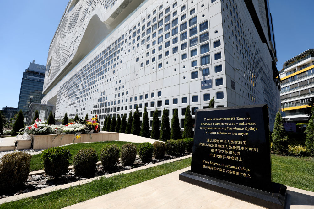2024年4月28日在塞爾維亞首都貝爾格萊德拍攝的貝爾格萊德中國(guó)文化中心大廈前的紀(jì)念碑。