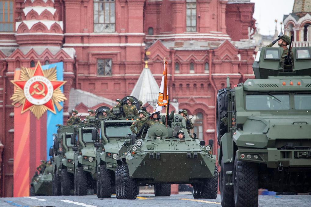 5月9日,在俄羅斯首都莫斯科,軍車編隊駛過紅場。新華社記者曹陽攝