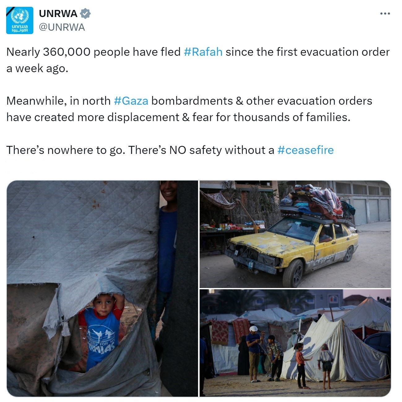 △聯(lián)合國近東救濟(jì)工程處13日通過社交媒體發(fā)表聲明稱,迫于以色列政府持續(xù)發(fā)布的強(qiáng)制疏散令,過去一周約有36萬巴勒斯坦平民撤出拉法,其中大多數(shù)人已經(jīng)在加沙境內(nèi)經(jīng)歷多次顛沛流離。