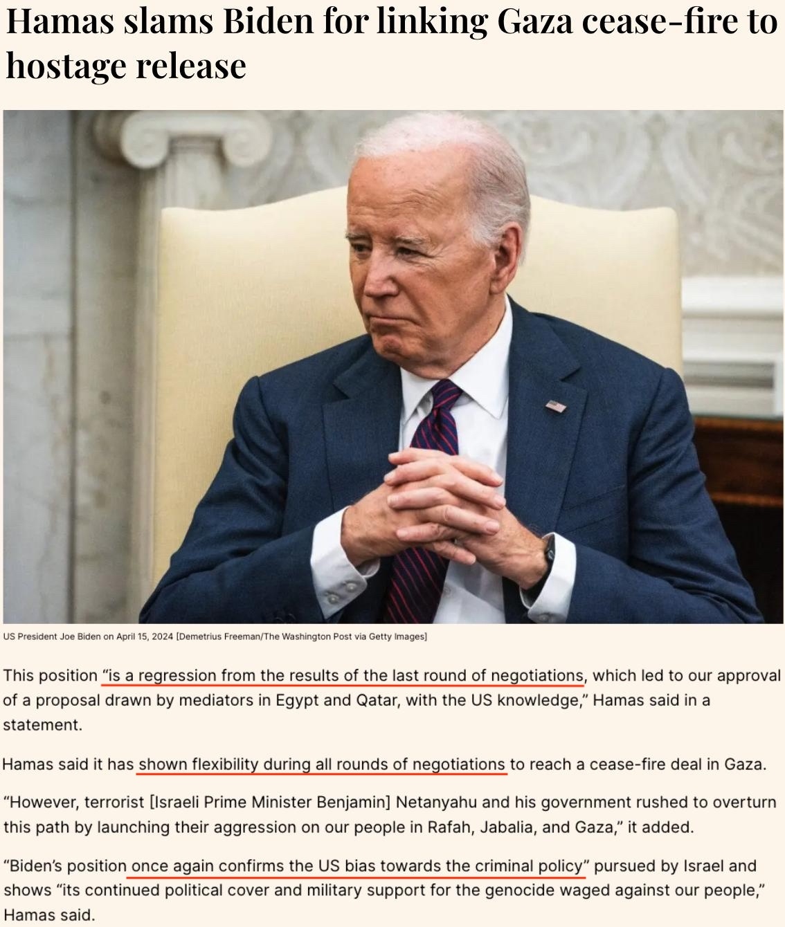 “拜登的言論令?;鹫勁羞M(jìn)程倒退,也再次證明了美國對以色列的偏袒”。
