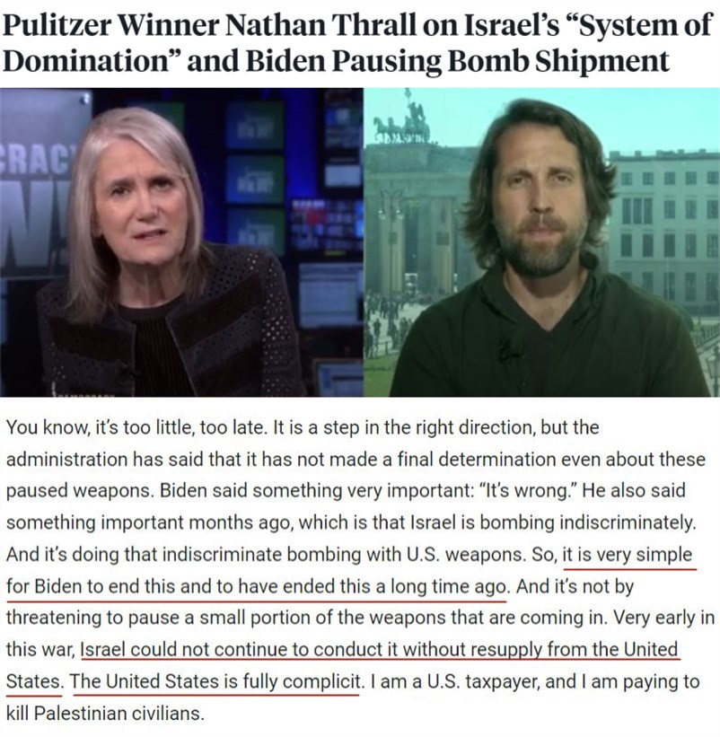 對此,常駐耶路撒冷的美國記者兼知名作家內(nèi)森·薩爾一針見血地指出,對于拜登來說,結(jié)束這一切其實(shí)很簡單,而且早該結(jié)束了,不必像現(xiàn)在這樣通過威脅暫停供應(yīng)一小部分武器來實(shí)現(xiàn)。