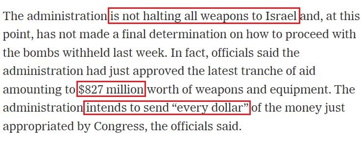 事實(shí)上,就在暫停向以色列運(yùn)送重型炸彈的同時(shí),拜登政府剛剛批準(zhǔn)了最新一批價(jià)值8.27億美元的對以軍事裝備援助。用美國官員們的話說,拜登政府打算把最新對以援助撥款的“每一美元”都用出去。