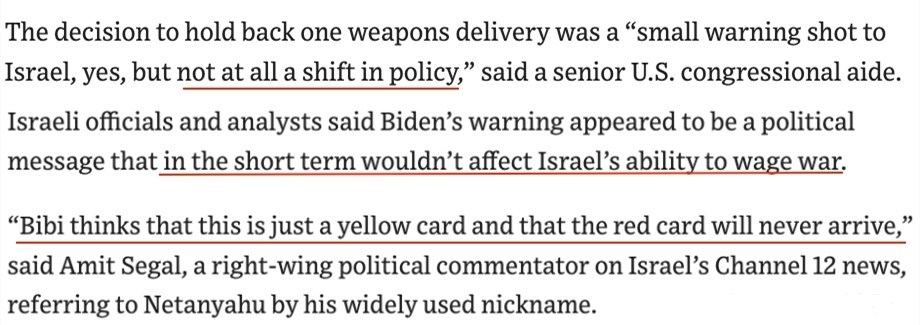 “比比(內(nèi)塔尼亞胡的昵稱)相信拜登只是對他亮出了一張黃牌,而紅牌永遠(yuǎn)不會到來?!?/p>