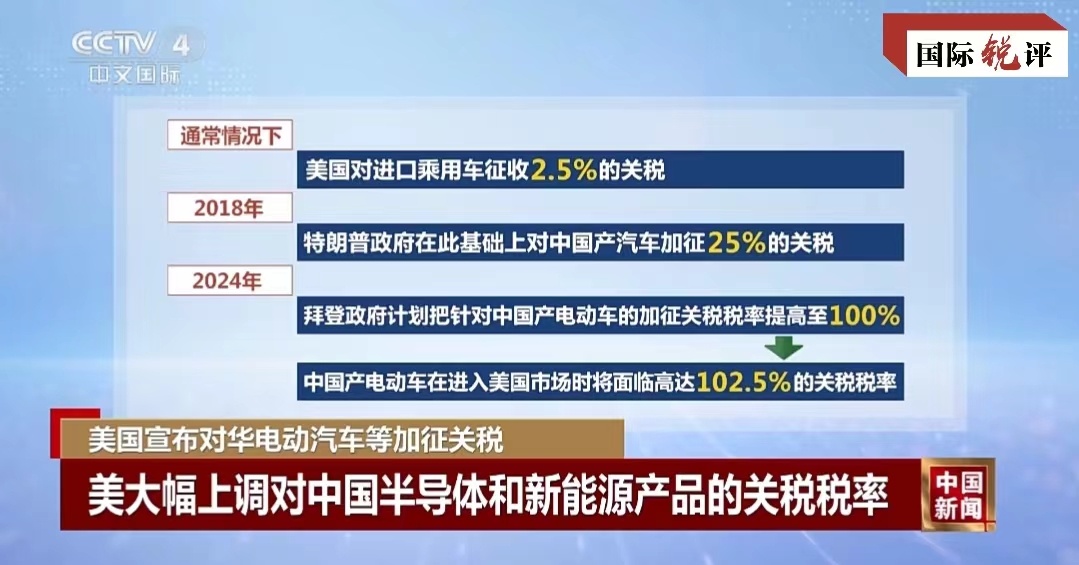 這其中,對中國電動汽車加征的進口關(guān)稅令人瞠目——從27.5%升至102.5%,對太陽能電池的進口稅從25%提高到50%,對鋰電池的關(guān)稅稅率從7.5%提高到25%。不難看出,美國政府此次針對的重點是中國新能源相關(guān)產(chǎn)業(yè)。難怪美國多名高官近期密集炒作所謂中國新能源“產(chǎn)能過剩”,不過是為加征關(guān)稅制造借口。