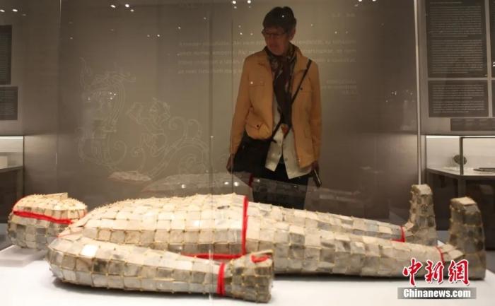 在匈牙利古都塞克什白堡舉行的“不朽的玉甲—中國(guó)漢代文物精品展”,共展出百余件玉器、漆器、陶器、青銅器、印章、石刻、錢(qián)幣等漢代文物,將漢代政治經(jīng)濟(jì)、社會(huì)生活、文化藝術(shù)和禮儀信仰逐一呈現(xiàn)。圖為當(dāng)?shù)貢r(shí)間5月7日,一名觀眾駐足細(xì)觀徐州博物館鎮(zhèn)館之寶西漢金縷玉衣。中新社記者 德永健 攝