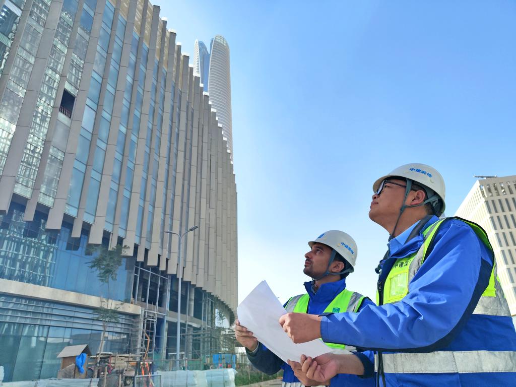 2023年11月27日,中建深圳裝飾有限公司項目經(jīng)理徐笑笑(右)與來自埃及的幕墻工程師艾哈邁德·賽義德在埃及開羅以東的埃及新行政首都中央商務(wù)區(qū)施工現(xiàn)場一同查看幕墻安裝進度(手機拍攝)。新華社發(fā)(中建深圳裝飾有限公司供圖)