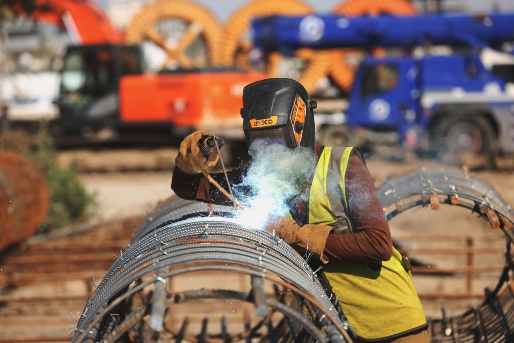 3月2日,一名中方員工在伊拉克巴格達(dá)尼蘇爾立體交通樞紐項目現(xiàn)場施工作業(yè)。新華社發(fā)(哈利勒·達(dá)伍德攝)