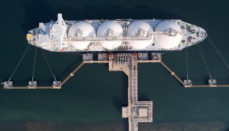 2022年10月21日,一艘液化天然氣運(yùn)輸船靠泊在中國石化天津LNG接收站“1號泊位”進(jìn)行卸船作業(yè)(無人機(jī)照片)。新華社記者趙子碩攝
