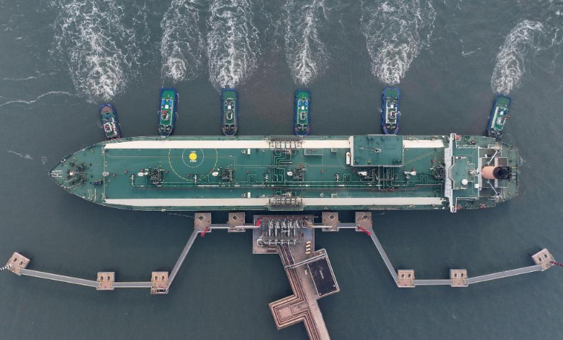 2023年11月15日,來自卡塔爾的“阿爾達(dá)夫那”號LNG輪在拖輪的協(xié)助下向唐山港曹妃甸港區(qū)中國石油唐山LNG接收站碼頭靠泊(無人機(jī)照片)。新華社記者楊世堯攝