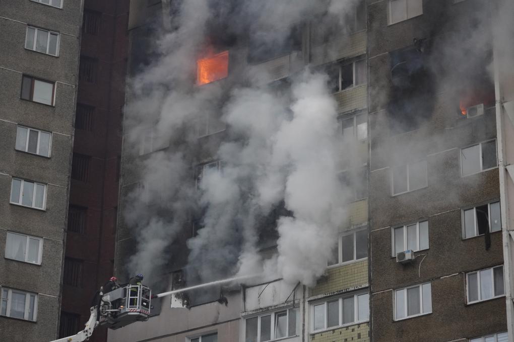 2月7日,消防員在烏克蘭基輔為被導彈碎片擊中的居民樓滅火。新華社發(fā)(羅曼·佩圖什科夫攝)