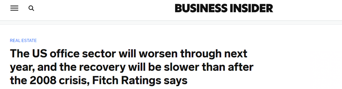 惠譽(yù)稱:“與2008年全球金融危機(jī)之后相比,此輪周期中寫字樓行業(yè)的復(fù)蘇將更加緩慢、耗時,并將導(dǎo)致美國房地產(chǎn)價值永久性受損、業(yè)績表現(xiàn)疲軟以及貸款損失增加。”