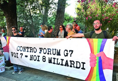 6月14日,在意大利法薩諾,抗議者打出“你們只有七個(gè),我們是八十億人”的標(biāo)語,批評(píng)七國(guó)集團(tuán)與世界完全割裂。新華社記者 李京攝