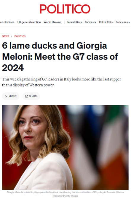 面對(duì)各自國內(nèi)嚴(yán)峻的政治形勢(shì),本次G7峰會(huì)開得真有些力不從心、心猿意馬。法德兩國領(lǐng)導(dǎo)人所在政黨在上周剛剛結(jié)束的歐洲議會(huì)選舉中表現(xiàn)堪憂;英國首相蘇納克更在朝不保夕中擔(dān)憂著自己的保守黨會(huì)在下月初大選中走到窮途末路;美國總統(tǒng)拜登更是處處遭逢著大選對(duì)手特朗普的咄咄逼人。美國政客新聞網(wǎng)歐洲版(Politico.eu)捕捉到了這種有趣的心不在焉的會(huì)議氛圍,以《六只跛腳鴨和梅洛尼》為題諷刺總結(jié)本次峰會(huì),“在意大利舉行的七國集團(tuán)峰會(huì)看起來更像是最后的晚餐,而不是西方力量的展示”。