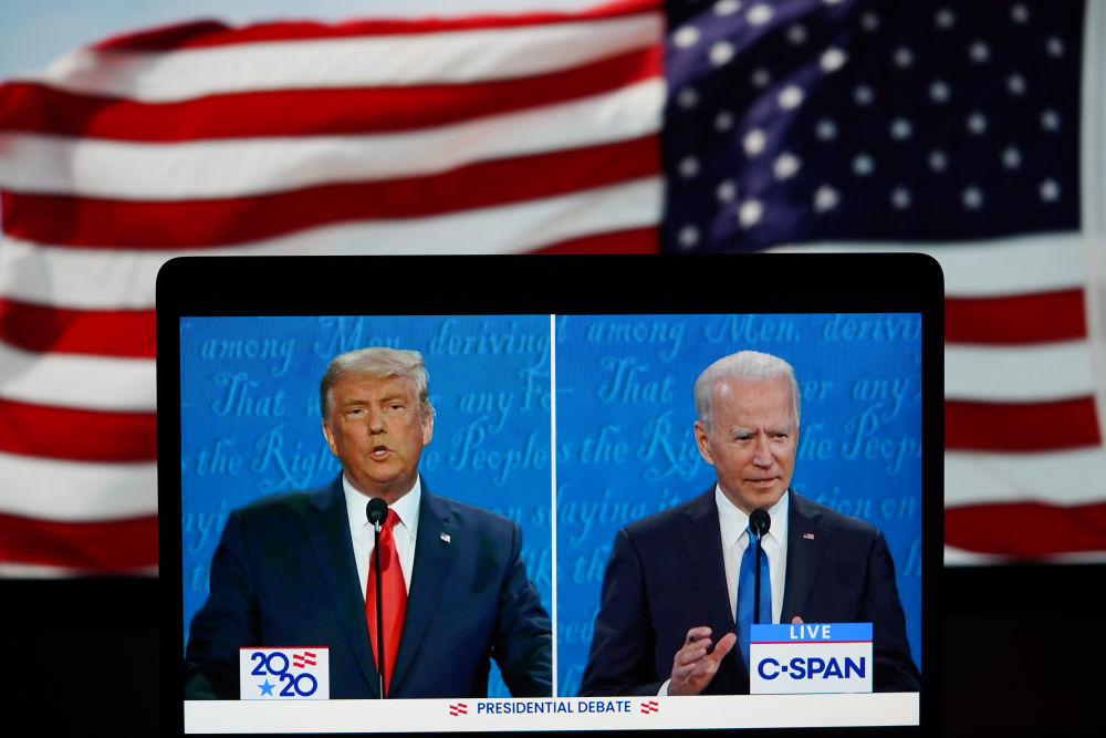 這張2020年10月22日在美國弗吉尼亞州阿靈頓拍攝的視頻畫面顯示,時任美國總統(tǒng)特朗普(左)與民主黨總統(tǒng)候選人拜登在田納西州納什維爾市參加最后一場總統(tǒng)候選人電視辯論。新華社記者劉杰攝