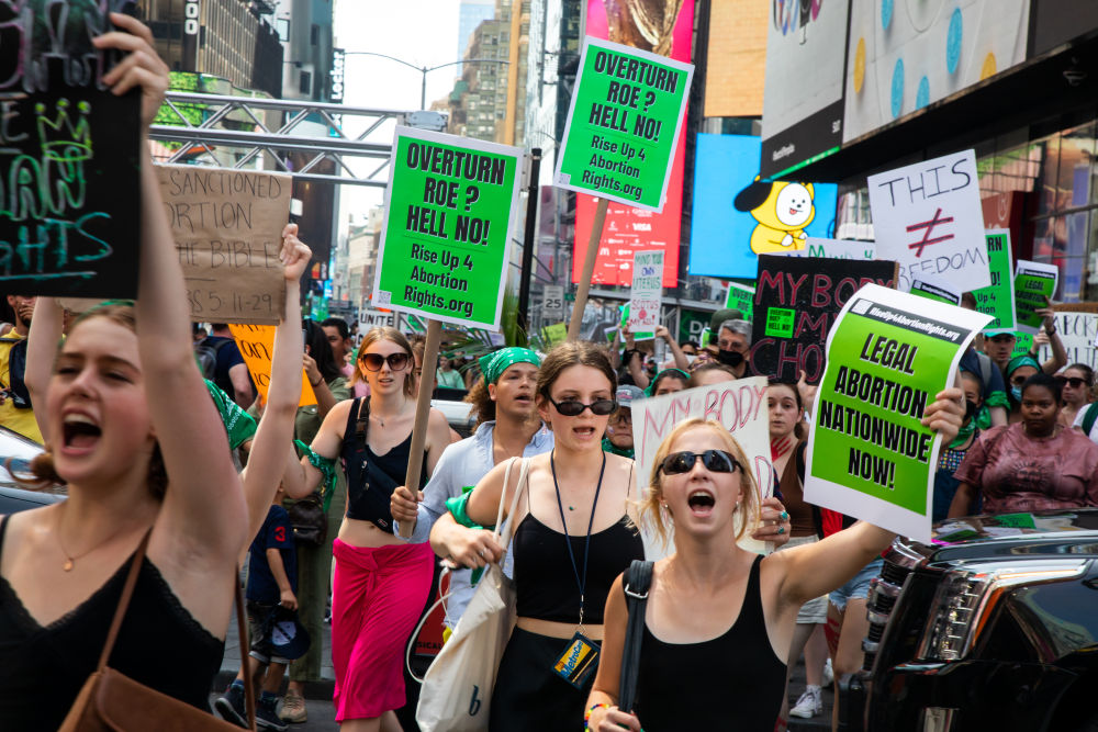 2022年7月4日,墮胎權(quán)支持者在美國紐約舉行示威游行。美國聯(lián)邦最高法院6月24日推翻近半個世紀前在聯(lián)邦層面確立墮胎權(quán)的判例“羅訴韋德案”,取消對女性墮胎權(quán)的憲法保護,引發(fā)廣泛爭議。新華社發(fā)(郭克攝)