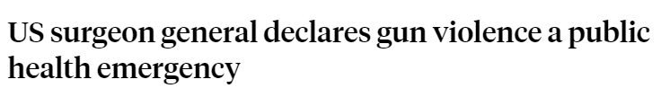 據(jù)美國廣播公司(ABC)25日報道,美國衛(wèi)生局局長維維克·穆西當天宣布,槍支暴力成為一場公共衛(wèi)生危機,原因是涉及槍支的傷亡人數(shù)快速增長。