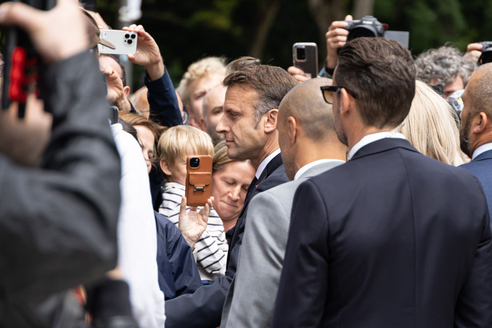 7月7日,在法國(guó)勒?qǐng)D凱,法國(guó)總統(tǒng)馬克龍?jiān)谕镀焙笈c民眾交流。新華社發(fā)(弗蘭克·博阿姆攝)