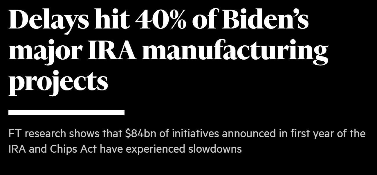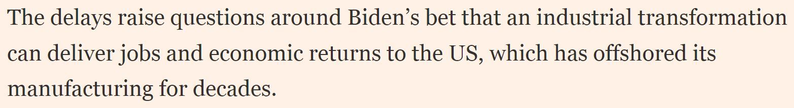 按照《金融時報》的說法,項目遲滯令輿論質(zhì)疑拜登政府所篤定的工業(yè)轉(zhuǎn)型有望為美國帶來就業(yè)和經(jīng)濟回報的說法。