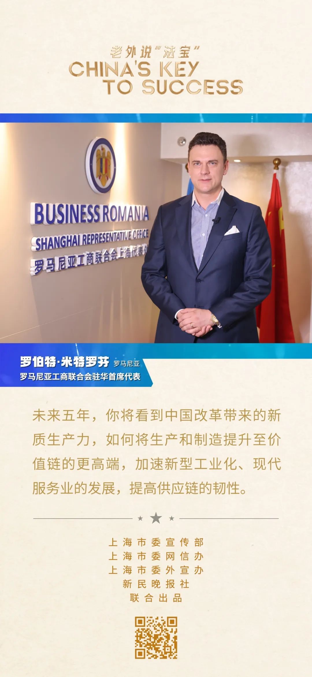羅馬尼亞工商聯(lián)合會(huì)是首個(gè)在中國注冊的羅馬尼亞非政府組織。作為首席代表,羅伯特對兩國間的商業(yè)貿(mào)易關(guān)系十分關(guān)注,尤其是在農(nóng)產(chǎn)品商貿(mào)、快速消費(fèi)品創(chuàng)投以及可再生能源等領(lǐng)域的合作。