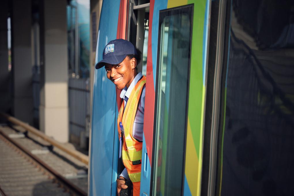 6月12日,在尼日利亞拉各斯,拉各斯輕軌藍線項目動車組列車司機組長伊莎貝拉·亞當斯·伊斯拉埃爾與列車合影。新華社發(fā),中土集團尼日利亞有限公司供圖