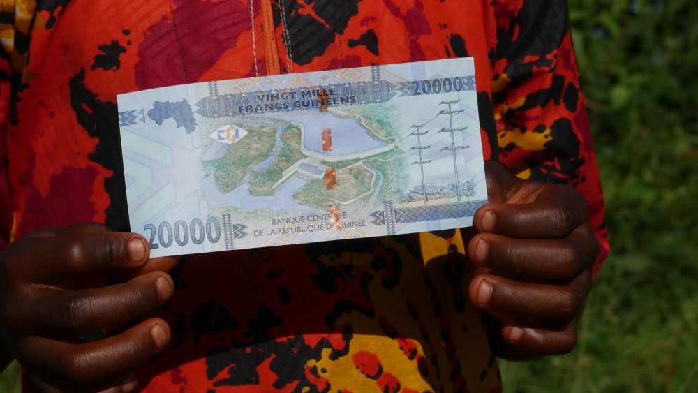 水電站的實際效果圖被印在面值2萬幾內亞法郎紙幣背面。2023年9月7日攝。新華社記者鄭揚子攝
