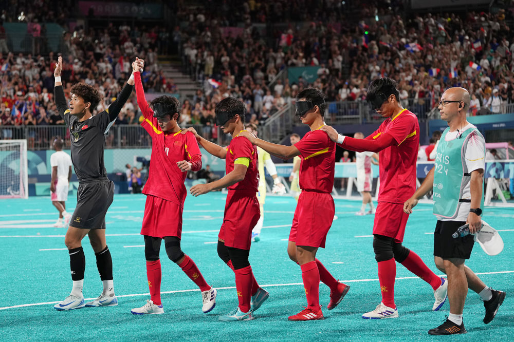 沒有華麗的踩單車過人,沒有炫酷的驚天倒鉤……除兩隊門將外,八名球員戴著黑色眼罩,在一次次奔跑、沖撞、摔倒、起身的動作中循環(huán)往復;比賽中,為不影響運動員發(fā)揮,現(xiàn)場觀眾只有在進球之后才能歡呼喝彩。