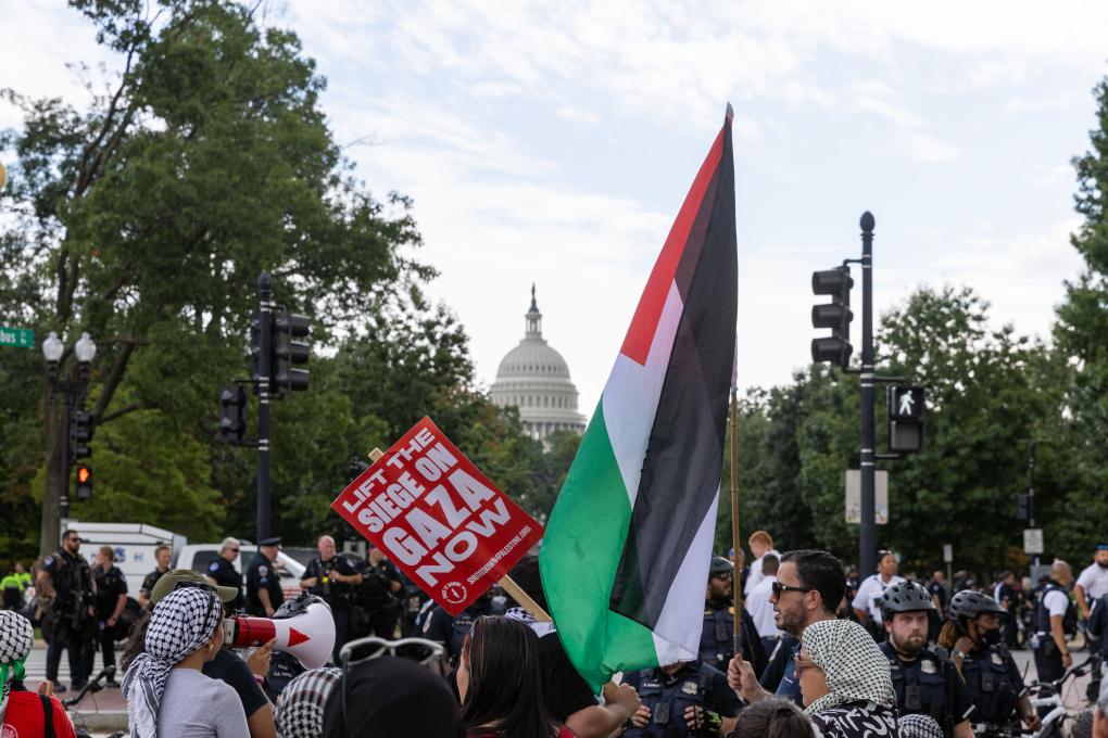 7月24日,以色列總理內(nèi)塔尼亞胡在美國國會發(fā)表演講,數(shù)以千計的抗議者在國會大廈外對此表示抵制。圖為抗議者在美國國會附近的聯(lián)合車站聚集。新華社記者胡友松攝