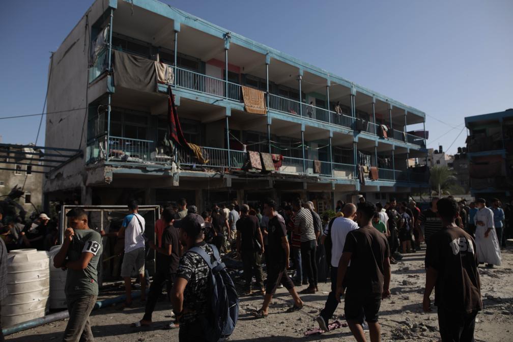 9月11日,在加沙地帶中部努賽賴特難民營,人們聚集在以軍轟炸后的學校廢墟附近。新華社發(fā)(馬爾萬·達烏德攝)