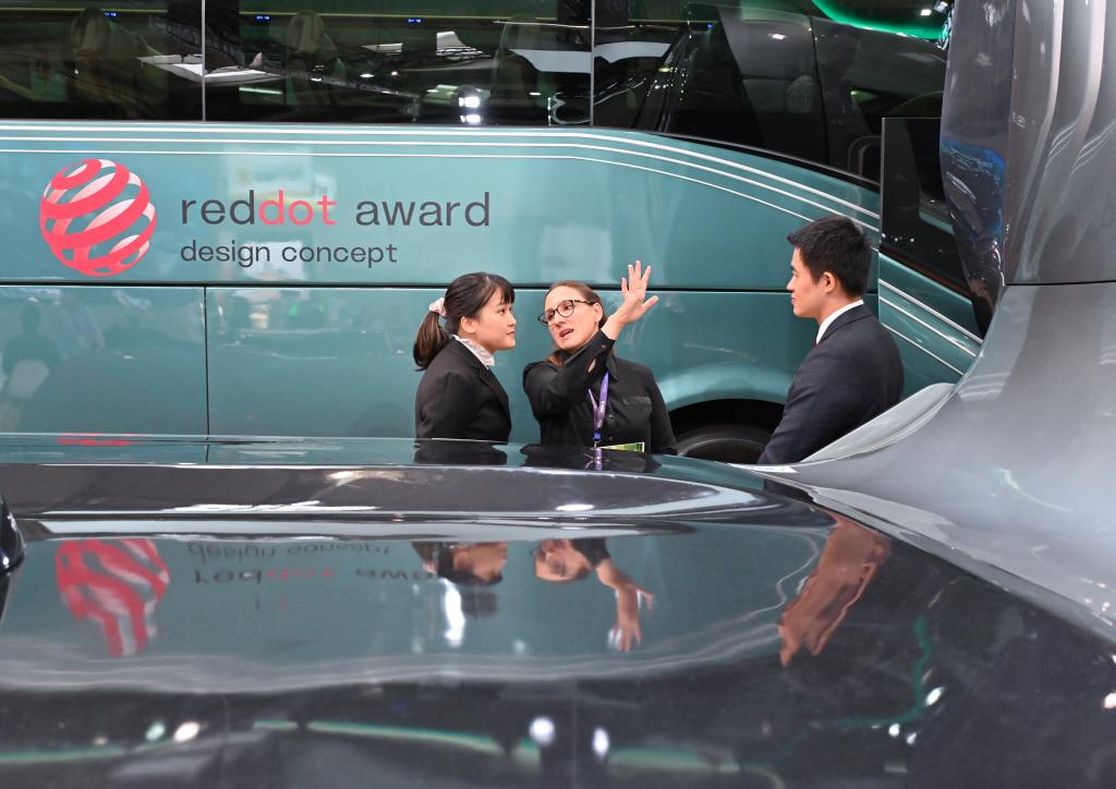 9月17日,在德國漢諾威國際交通運輸博覽會上,一名女子(中)在廈門金龍展區(qū)參觀。新華社記者任鵬飛攝