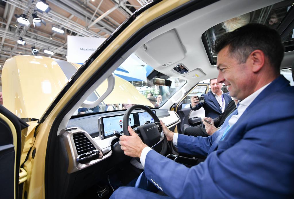 9月16日,在德國漢諾威國際交通運輸博覽會媒體預(yù)展上,一名男子體驗上汽大通eTerron 9純電皮卡車。新華社記者任鵬飛攝