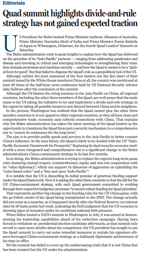 原文標(biāo)題:Quad summit highlights divide-and-rule strategy has not gained expected traction