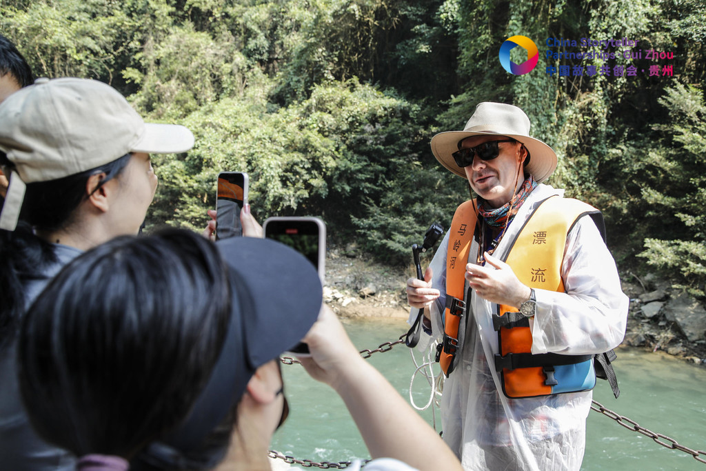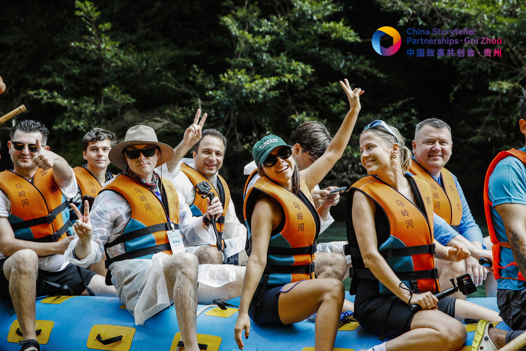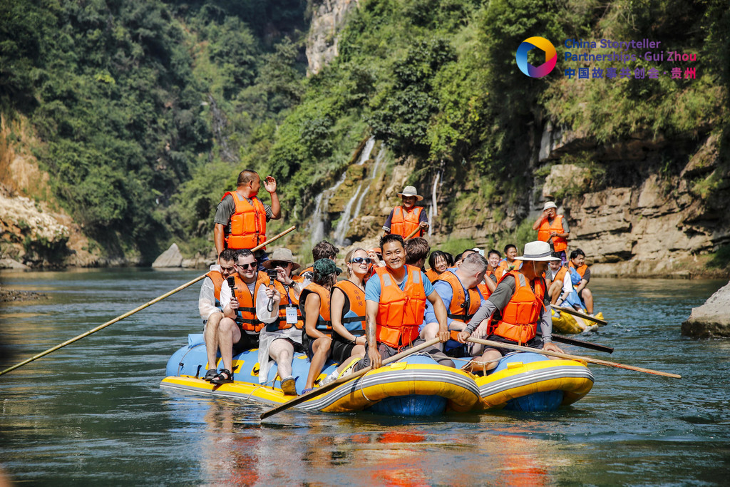 采訪團(tuán)外籍成員在興義市馬嶺河峽谷體驗(yàn)漂流戲水,享受清涼時(shí)光。
