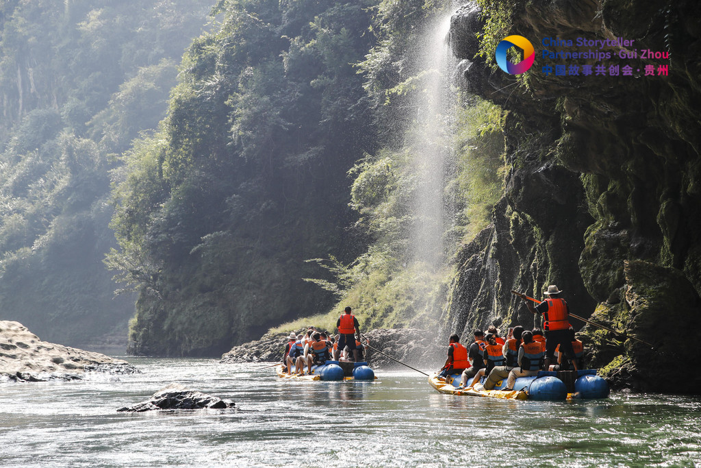 2024中國(guó)故事共創(chuàng)會(huì)“外籍網(wǎng)紅貴州行”采訪團(tuán)外籍成員在興義市馬嶺河峽谷體驗(yàn)漂流。