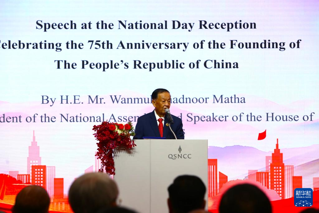 9月24日,在泰國曼谷,泰國國會(huì)主席兼下議長萬·穆罕默德·努爾·瑪他在中國駐泰國大使館國慶75周年招待會(huì)上致辭。新華社記者 孫瑋彤 攝