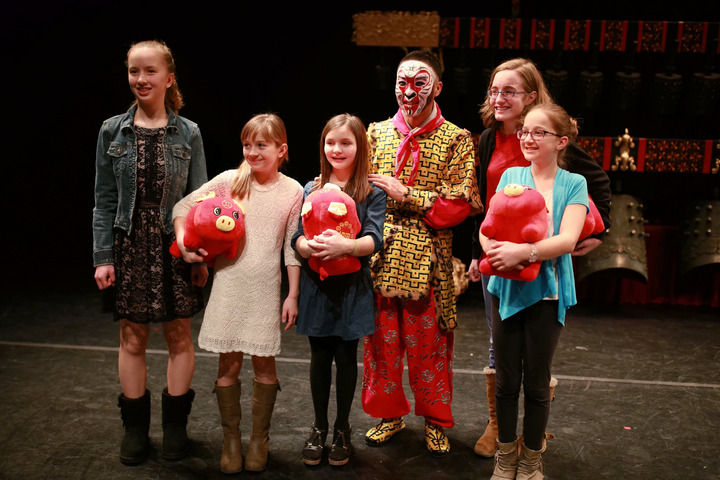 2019年2月14日,在美國馬斯卡廷,當?shù)赜^眾在演出結(jié)束后與扮演孫悟空的中國國家京劇院演員合影。當晚,由湖北省歌劇舞劇院編鐘國樂團和中國國家京劇院一團的藝術(shù)家們聯(lián)袂奉獻的“歡樂春節(jié)”大戲在這里上演。新華社記者 汪平 攝