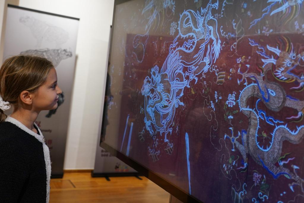 9月27日,在比利時(shí)布魯塞爾中國(guó)文化中心,觀眾在“看見中國(guó)”之《紋樣與色彩:中華工藝之美》數(shù)字文化展上參觀。新華社記者 彭子洋 攝