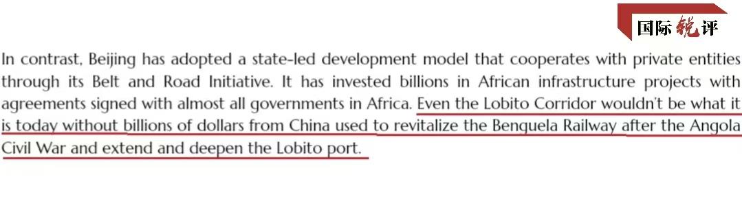 黎文濤認(rèn)為,美國試圖把“洛比托走廊”包裝成美歐為非洲基建作出的貢獻(xiàn),完全不符合事實。因為它的核心骨架中國早已搭好,中國才是名副其實的最大貢獻(xiàn)者?!奥灞韧凶呃取惫倬W(wǎng)上也有這樣一段話:“如果沒有中國投入數(shù)十億美元重建本格拉鐵路、擴(kuò)建洛比托港口,‘洛比托走廊’就沒有當(dāng)今的模樣。”