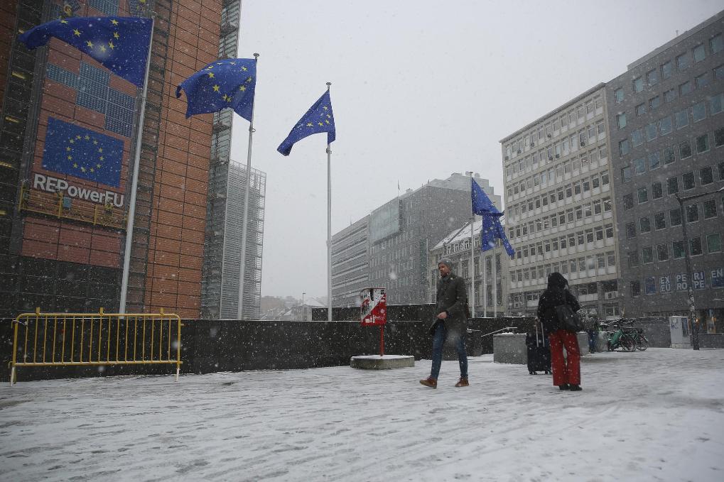 1月17日,在位于比利時(shí)布魯塞爾的歐盟總部附近,人們冒雪出行。新華社記者趙丁喆攝